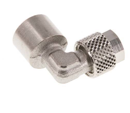 This nickel plated brass elbow push-on fitting is designed with one push-on connection and with one female threaded connection. Connection 1 is a 6x4 mm push-on connection. Connection 2 has G 1/8 inch female threads. The operating pressure corresponds to the pipes or hoses used.
