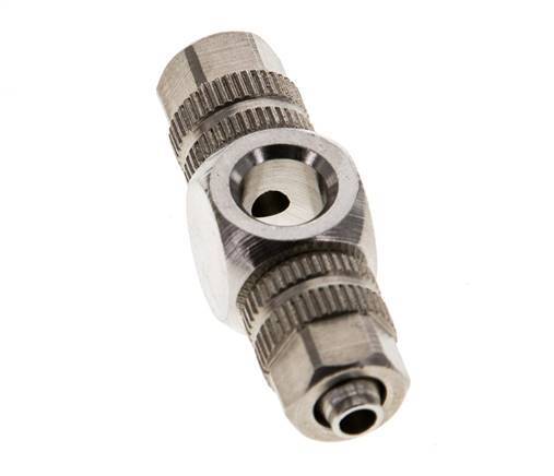 This nickel plated brass banjo tee push-on fitting is designed with two push-on connections and a banjo bolt hole. Connection 1 is a 4.3x3 mm push-on connection. Connection 2 is a 4.3x3 mm push-on connection. The banjo bolt with M 5 threads is suitable with this fitting. The banjo bolt is not included.