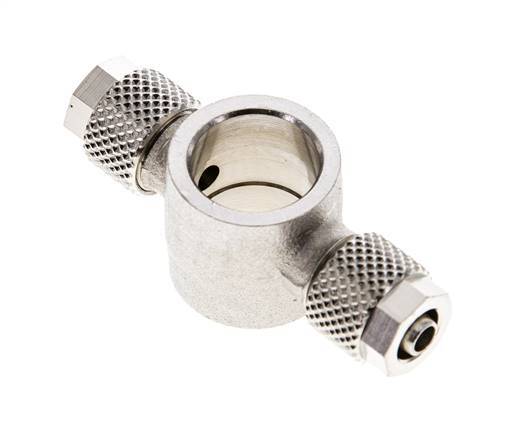 This nickel plated brass banjo tee push-on fitting is designed with two push-on connections and a banjo bolt hole. Connection 1 is a 6x4 mm push-on connection. Connection 2 is a 6x4 mm push-on connection. The banjo bolt with G 1/4 inch threads is suitable with this fitting. The banjo bolt is not included.