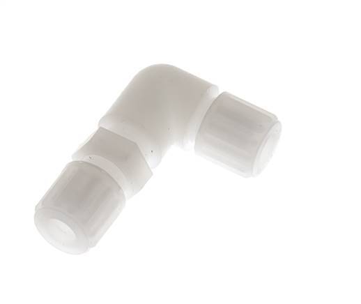 This pvdf elbow screw connection is designed with two compression ring connection points. Connection 1 is a 8x6 mm compression ring. Connection 2 is a