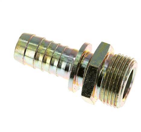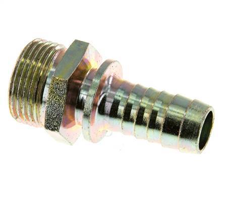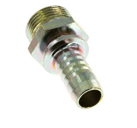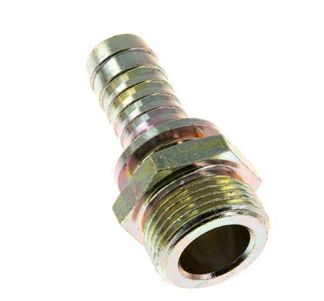 This zink plated steel hose screw-in connection is designed with a hose pillar and a male thread. Connection 1 is hose pillar, designed for a hose with an inner diameter of 19 mm (3/4 inch). Connection 2 has G 1 inch male threads. The maximum pressure is 25 bar (363 psi). The fitting is suitable for temperatures from -40 to 95 °C (-40 to 203 °F). The nominal diameter is 15 mm.