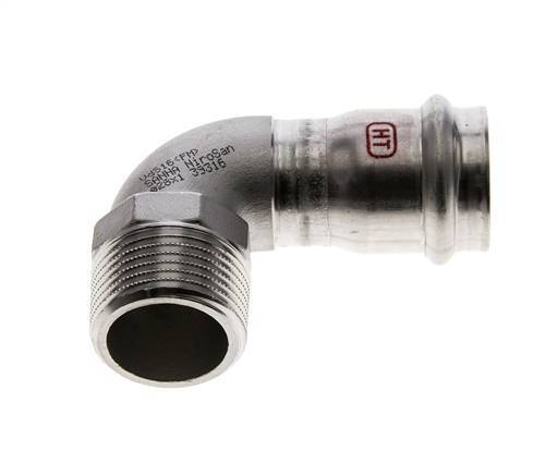 This is a 90 degree elbow press fitting made from stainless steel 1.4404. The fitting has a female press port and a male threaded port. Connection 1 is designed for a tube with an outer diameter of 28 mm and connection 2 has R 1 inch male threads. The fitting has an FKM sealing ring. The maximum pressure is 25 bar (363 psi). The fitting is suitable for temperatures from -20 to 200 °C (-4 to 392 °F). Temporary, the max temperature can be +280 °C (536 °F). The fitting length is 67 mm.