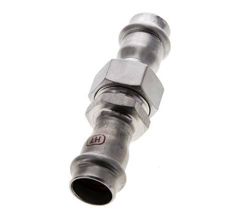 This is a union straight press fitting made from stainless steel 1.4404. The fitting has two female press ports. Connection 1 and 2 are designed for a tube with an outer diameter of 18 mm. The fitting has an FKM sealing ring. It also has a flat seal made of centellen. The maximum pressure is 40 bar (580 psi). The fitting is suitable for temperatures from -20 to 200 °C (-4 to 392 °F). Temporary, the max temperature can be +280 °C (536 °F). The fitting length is 107 mm.
