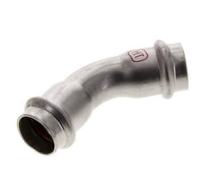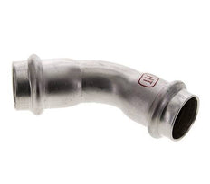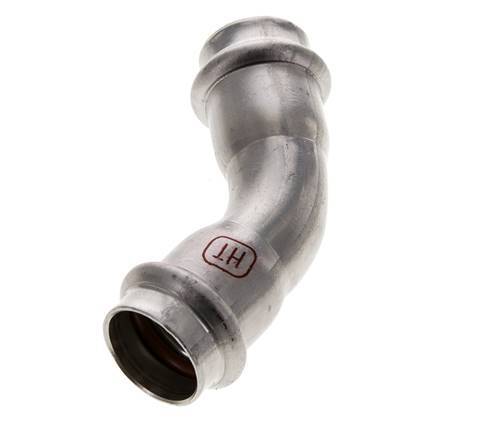 This is a 45 degree elbow press fitting made from stainless steel 1.4404. The fitting has two female press ports. Connection 1 and 2 are designed for a tube with an outer diameter of 22 mm. The fitting has an FKM sealing ring. The maximum pressure is 40 bar (580 psi). The fitting is suitable for temperatures from -20 to 200 °C (-4 to 392 °F). Temporary, the max temperature can be +280 °C (536 °F). The fitting length is 48 mm.