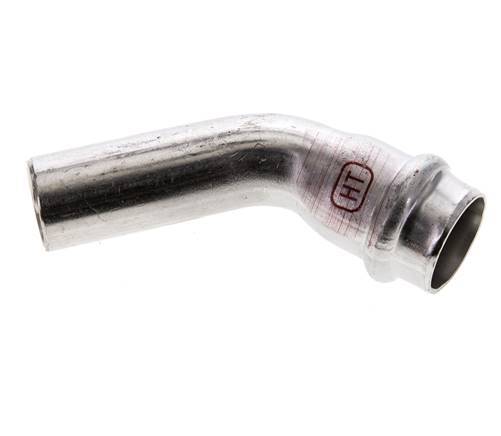 This is a 45 degree elbow press fitting made from stainless steel 1.4404. The fitting has a male press (FTG) port and a female press port. Connection 1 is designed for a tube with an outer diameter of 18 mm and connection 2 has a male press connection with a 18 mm outer diameter. The fitting has an FKM sealing ring. The maximum pressure is 40 bar (580 psi). The fitting is suitable for temperatures from -20 to 200 °C (-4 to 392 °F). Temporary, the max temperature can be +280 °C (536 °F). The fitting length is 39 mm.