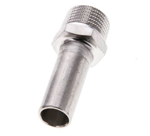 This is a straight press fitting made from stainless steel 1.4404. The fitting has a male press (FTG) port and a male threaded port. Connection 1 has a male press connection with a 15 mm outer diameter and connection 2 has R 1/2 inch male threads. The fitting has an FKM sealing ring. The maximum pressure is 40 bar (580 psi). The fitting is suitable for temperatures from -20 to 200 °C (-4 to 392 °F). Temporary, the max temperature can be +280 °C (536 °F). The fitting length is 59 mm.