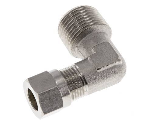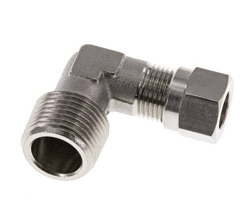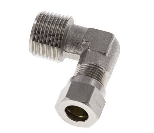 This nickel plated brass elbow screw in connection is designed with one male threaded connection and one cutting ring connection port. Connection 1 is a 8 mm cutting ring with a M12x1 union nut. Connection 2 has male R 3/8 inch threads. The maximum pressure is 100 bar (1450 psi). The fitting is suitable for temperatures from -60 to 300 °C (-76 to 572 °F). It is made in accordance with DIN EN ISO 8434-1 (DIN 2353).