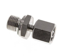 This stainless steel 1.4571 straight screw in connection is designed with swivel tube connection port and a threaded connection. It has an adjustable connection. Connection 1 has a 6 mm swivel tube connection. Connection 2 has male G 1/4 inch threads. The seal material is FKM. The maximum pressure is 630 bar (9135 psi). The fitting is suitable for temperatures from -20 to 200 °C (-4 to 392 °F). It is made in accordance with DIN EN ISO 8434-1 (DIN 2353).