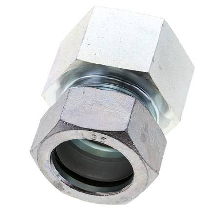 This zink plated steel straight screwed-on screw connection is designed with one female threaded connection and one cutting ring connection port. Connection 1 is a 35 mm cutting ring with a M45x2 union nut. Connection 2 has female M 42x2 threads. The maximum pressure is 160 bar (2320 psi). The fitting is suitable for temperatures from -40 to 120 °C (-40 to 248 °F). It is made in accordance with DIN EN ISO 8434-1 (DIN 2353).