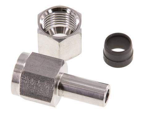 This stainless steel 1.4571 straight screwed-on screw connection is designed with This fittings is designed to use with pressure gauge. Connection 1 has a 10 mm swivel tube connection. Connection 2 has female G 1/4 inch threads. The maximum pressure is 315 bar (4568 psi). The fitting is suitable for temperatures from -60 to 400 °C (-76 to 752 °F). It is made in accordance with DIN EN ISO 8434-1 (DIN 2353).