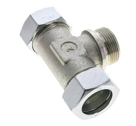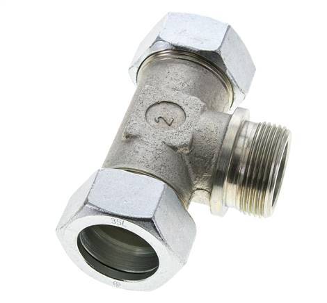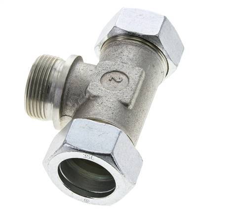 This zink plated steel Tee screw connection is designed with one male threaded connection and two cutting ring connection ports in a T-shape. Connection 1 is a 35 mm cutting ring with a M45x2 union nut. Connection 2 is a 35 mm cutting ring with a M45x2 union nut. Connection 3 has male G 1-1/4 inch threads. The maximum pressure is 160 bar (2320 psi). The fitting is suitable for temperatures from -40 to 120 °C (-40 to 248 °F). It is made in accordance with DIN EN ISO 8434-1 (DIN 2353).