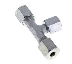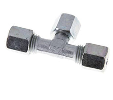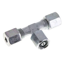 This zink plated steel Tee screw connection is designed with cutting ring and swivel tube connection ports. It has an adjustable connection. Connection 1 is a 6 mm cutting ring with a M14x1.5 union nut. Connection 2 is a 6 mm cutting ring with a M14x1.5 union nut. Connection 3 has a 6 mm swivel tube connection. The seal material is NBR. The maximum pressure is 630 bar (9135 psi). The fitting is suitable for temperatures from -35 to 100 °C (-31 to 212 °F). It is made in accordance with DIN EN ISO 8434-1 (DIN 2353).