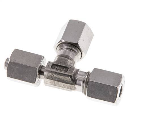 This stainless steel 1.4571 Tee screw connection is designed with cutting ring and swivel tube connection ports. It has an adjustable connection. Connection 1 is a 6 mm cutting ring with a M12x1.5 union nut. Connection 2 is a 6 mm cutting ring with a M12x1.5 union nut. Connection 3 has a 6 mm swivel tube connection. The maximum pressure is 315 bar (4568 psi). The fitting is suitable for temperatures from -60 to 400 °C (-76 to 752 °F). It is made in accordance with DIN EN ISO 8434-1 (DIN 2353).