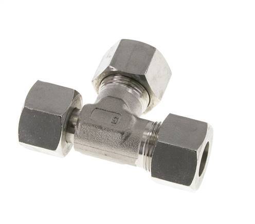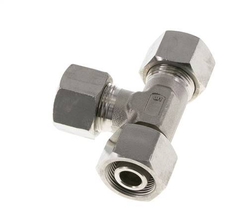 This stainless steel 1.4571 Tee screw connection is designed with cutting ring and swivel tube connection ports. It has an adjustable connection. Connection 1 is a 16 mm cutting ring with a M24x1.5 union nut. Connection 2 is a 16 mm cutting ring with a M24x1.5 union nut. Connection 3 has a 16 mm swivel tube connection. The maximum pressure is 400 bar (5800 psi). The fitting is suitable for temperatures from -60 to 400 °C (-76 to 752 °F). It is made in accordance with DIN EN ISO 8434-1 (DIN 2353).