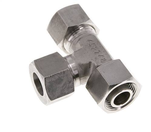 This stainless steel 1.4571 Tee screw connection is designed with cutting ring and swivel tube connection ports. It has an adjustable connection. Connection 1 is a 20 mm cutting ring with a M30x2 union nut. Connection 2 is a 20 mm cutting ring with a M30x2 union nut. Connection 3 has a 20 mm swivel tube connection. The maximum pressure is 400 bar (5800 psi). The fitting is suitable for temperatures from -60 to 400 °C (-76 to 752 °F). It is made in accordance with DIN EN ISO 8434-1 (DIN 2353).
