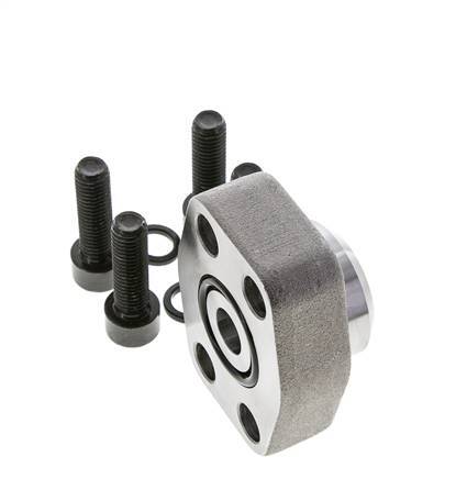 This is an SAE flange with a female thread connection. It adheres to SAE Code 62 (6000 psi working pressure) and has an SAE-4 mounting pattern size of 3/4 inch. Connection 2 has G 1/2" female threads. The body is made of plain steel with an NBR seal. The maximum pressure is 420 bar (6090 psi) and the fitting is suitable for temperatures from -30 to 90 °C (-22 to 194 °F). It is made in accordance with the ISO 6162-2.