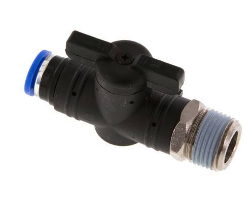 This is a nickel-plated brass/pa66/pps 2-way straight ball valve for open/close control of the air flow. It has a 8 mm push-in fitting on one side and an R 3/8 inch male threaded port on the other side. It has NBR seals that make it suitable for applications within a temperature range from -20 to 80 °C (-4 to 176 °F). The operating pressure range is -0.95 to 20 bar (-14 to 290 psi), making it suitable for vacuums. Use the quarter-turn handle to open or close the valve.