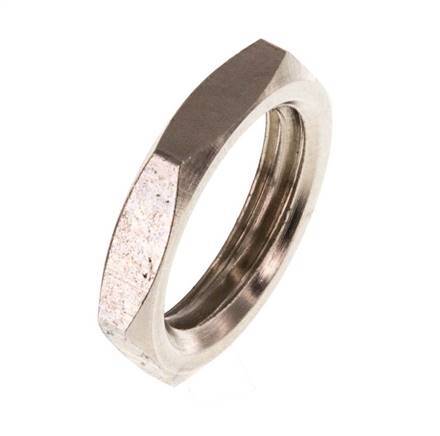 This lock nut is made of nickel plated brass and has G threads. A locking nut resists loosening from vibrations and torque.