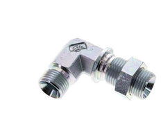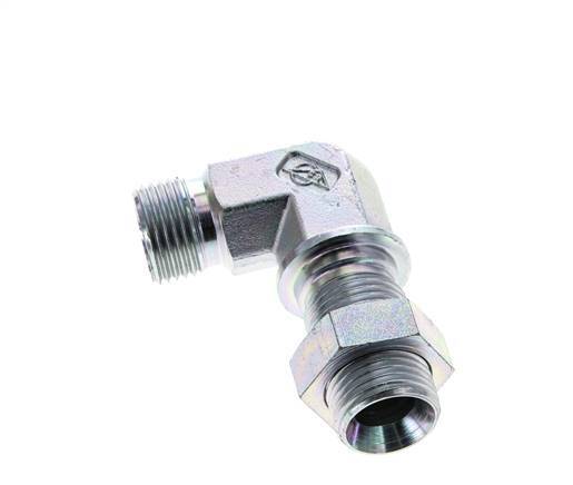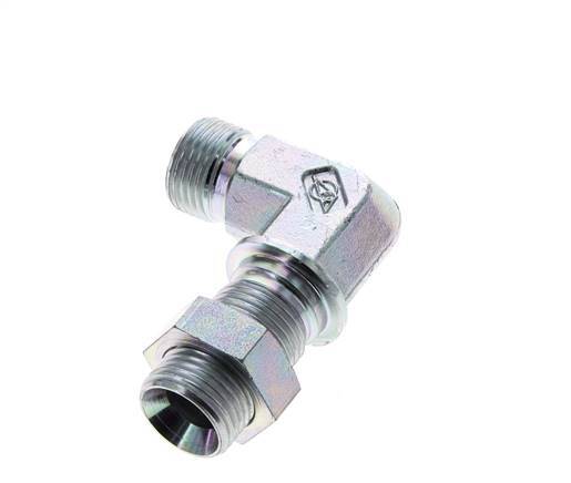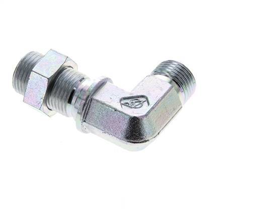 This is a 90-degree elbow bulkhead fitting. It is used for high pressure hydraulic applications up to 350 bar (4917.5 psi). Zinc-coated steel fittings provide some corrosion resistance, but are not meant for corrosive environments. It has a 60° cone seat design.