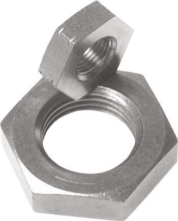 This hexagonal lock nut is made of stainless steel and has metric threads. A locking nut resists loosening from vibrations and torque.