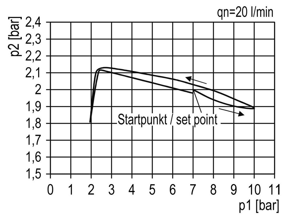 This filter regulator (FR) combines two functions. The filter removes water, dirt and other harmful particles larger than 40 microns. The pressure regulator adjusts the pressure continuously to a stable level, even when the input pressure varies. The level can be adjusted between 0.1 to 3.0 bar (1 to 44 psi). This model has G 1 inch ports. The maximum flow rate is 12000 l/min. Please note that the maximum flow rate alone doesn't provide enough information to proper sizing. Use the flow curve to determine if the pressure drop (droop) within your expected flow rate range is acceptable. The flow curve shows the flow rate for a set input pressure with multiple output pressures. For each output pressure, it can be seen how the pressure changes with increasing flow rate. It is recommended to use the device in the flat range of the curve, and not on the beginning or the end of the curve. Note that the pressure regulator controls the output pressure, not the flow rate. The output pressure can be adjusted by pulling the hand wheel up and twisting.