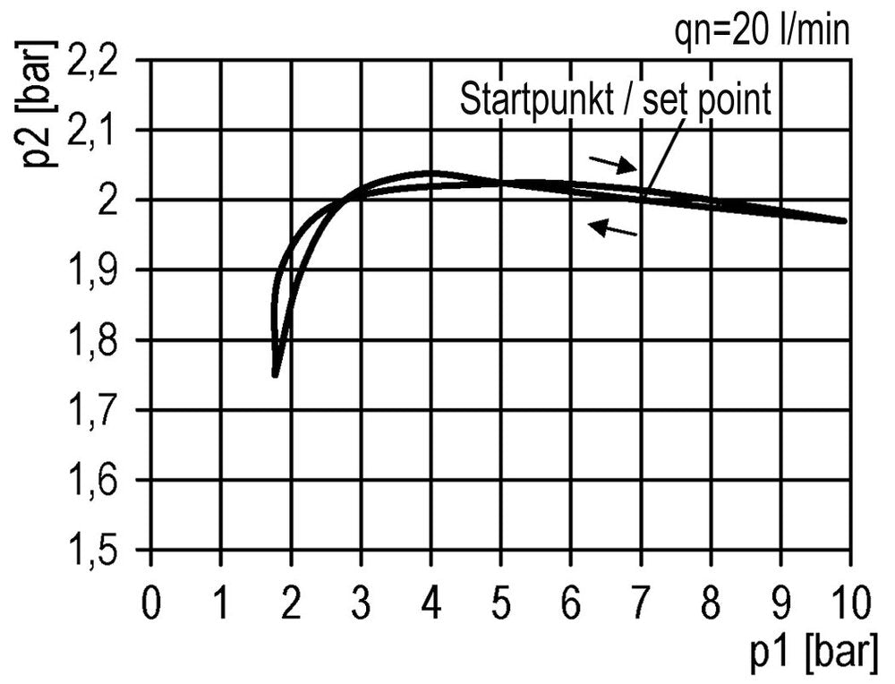 This filter regulator (FR) combines two functions. The filter removes water, dirt and other harmful particles larger than 5 microns. The pressure regulator adjusts the pressure continuously to a stable level, even when the input pressure varies. The level can be adjusted between 0.2 to 4.0 bar (3 to 58 psi). This model has G 3/8 inch ports. The maximum flow rate is 4500 l/min. Please note that the maximum flow rate alone doesn't provide enough information to proper sizing. Use the flow curve to determine if the pressure drop (droop) within your expected flow rate range is acceptable. The flow curve shows the flow rate for a set input pressure with multiple output pressures. For each output pressure, it can be seen how the pressure changes with increasing flow rate. It is recommended to use the device in the flat range of the curve, and not on the beginning or the end of the curve. Note that the pressure regulator controls the output pressure, not the flow rate. The output pressure can be adjusted by pulling the hand wheel up and twisting. It can be locked after adjustment by pushing the hand wheel back in.
