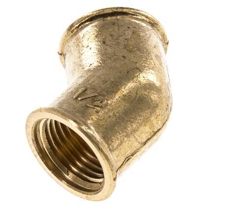 This brass elbow is designed with female threads at an angle. Connection 1 has Rp 1/2 inch threads. Connection 2 has Rp 1/2 inch threads. The input and the output are at a 45° angle. Max pressure of 16 bar (232 psi).