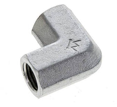 This elbow is designed with female threads at an angle. Connection 1 has female NPT 1/4 inch threads. Connection 2 has female NPT 1/4 inch threads. It is an elbow fitting. It is made out of steel and is galvanic/electrolytic zinc plated for surface protection. At 20 °C (68 °F), it can handle a maximum pressure of 275 bar (3989 psi). The input and the output are at a 90° angle.