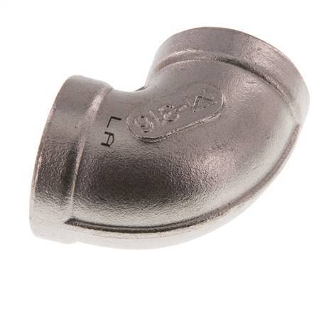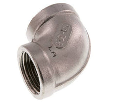This elbow is designed with female threads at an angle. Connection 1 has female NPT 3/4 inch threads. Connection 2 has female NPT 3/4 inch threads. It is an elbow fitting. It is made out of stainless steel (1.4408). At 20 °C (68 °F), it can handle a maximum pressure of 16 bar (232 psi). The input and the output are at a 90° angle.