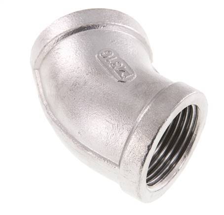 This elbow is designed with female threads at an angle. Connection 1 has Rp 1 inch threads. Connection 2 has Rp 1 inch threads. It is an elbow fitting. It is made out of stainless steel (1.4408). At 20 °C (68 °F), it can handle a maximum pressure of 16 bar (232 psi). The input and the output are at a 45° angle.