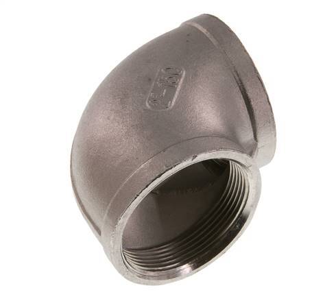 This stainless steel elbow is designed with female threads at an angle. Connection 1 has Rp 2 inch threads. Connection 2 has Rp 2 inch threads. The input and the output are at a 90° angle. Max pressure of 16 bar (232 psi).