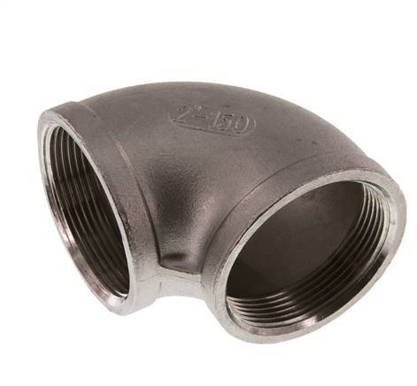 This elbow is designed with female threads at an angle. Connection 1 has Rp 2 inch threads. Connection 2 has Rp 2 inch threads. It is an elbow fitting. It is made out of stainless steel (1.4408). At 20 °C (68 °F), it can handle a maximum pressure of 16 bar (232 psi). The input and the output are at a 90° angle.
