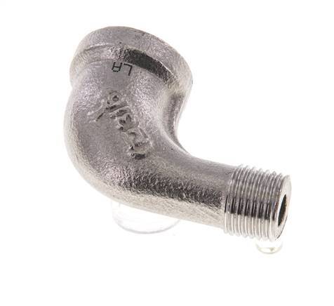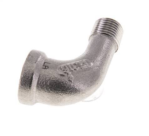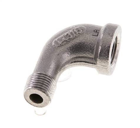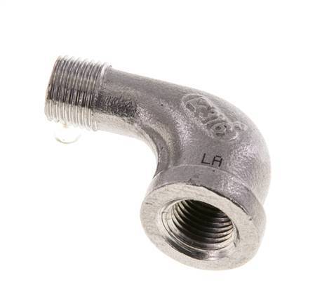 This screw-in elbow is designed with one male and one female threaded connection. Connection 1 has female NPT 1/8 inch threads. Connection 2 has male NPT 1/8 inch threads. It is an elbow fitting. It is made out of stainless steel (1.4408). At 20 °C (68 °F), it can handle a maximum pressure of 16 bar (232 psi). The input and the output are at a 90° angle.