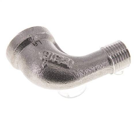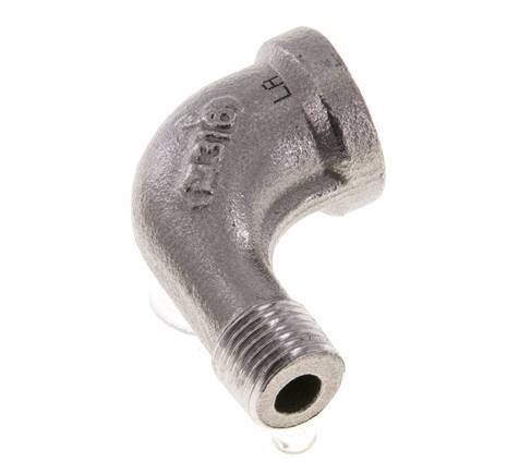 This stainless steel screw-in elbow is designed with one male and one female threaded connection. Connection 1 has female NPT 1/8 inch threads. Connection 2 has male NPT 1/8 inch threads. The input and the output are at a 90° angle. Max pressure of 16 bar (232 psi).