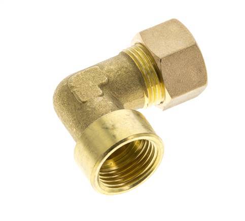 This brass elbow screw connection is designed with a female connection point to a compression ring fitting. Connection 1 has female G 1/2 inch threads. Connection 2 is a 14 mm compression ring. The input and the output are at a 90° angle. Suitable for temperatures from -60 °C to 300 °C (-76 °F to 572 °F). Max pressure of 89 bar (1291 psi). It is made in accordance with the DIN EN 1254-2.