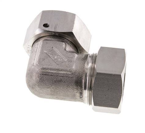 This stainless steel elbow screw connection is designed with a cutting ring connection point and a union nut connection point. Connection 1 is a 45 mm union nut. Connection 2 is a 35 mm cutting ring. The sealing is FKM / PTFE. The input and the output are at a 90° angle. Suitable for temperatures from -20 °C to 200 °C (-4 °F to 392 °F). Max pressure of 160 bar (2321 psi). Rated for an L (light) load class. It is made in accordance with the DIN EN ISO 8434-1 (DIN 2353).
