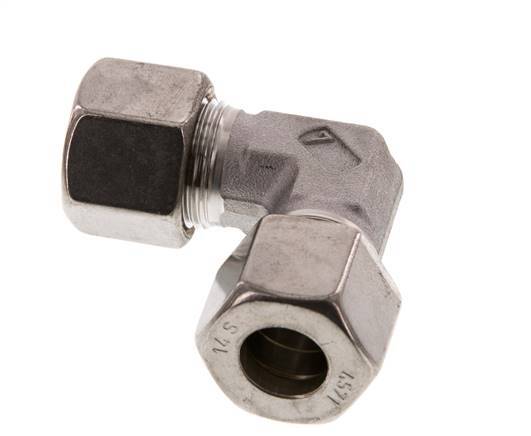This stainless steel elbow screw connection is designed with cutting ring connections. Connection 1 is a 14 mm compression ring. Connection 2 is a 14 mm compression ring. The input and the output are at a 90° angle. Suitable for temperatures from -60 °C to 400 °C (-76 °F to 752 °F). Max pressure of 630 bar (9138 psi). Rated for an S (heavy) load class. It is made in accordance with the DIN EN ISO 8434-1 (DIN 2353).