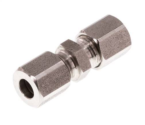 This straight screw connection is designed with two cutting ring connection points. Connection 1 is a 6 mm cutting ring. Connection 2 is a 6 mm cutting ring. It is a straight fitting. It is made out of stainless steel (1.4571). It is suitable for media within a temperature range of -60 °C to 400 °C (-76 °F to 752 °F). At 20 °C (68 °F), it can handle a maximum pressure of 100 bar (1450 psi). According to the DIN 2353, it has an LL (very light) load class. It is made in accordance with the DIN EN ISO 8434-1 (DIN 2353).