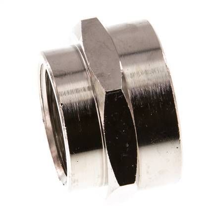 This sleeve (reducing socket) is designed with reducing threads (hexagonal body). Connection 1 has female G 1 inch threads. Connection 2 has female G 3/4 inch threads. It is a straight fitting. It is made out of brass and is nickel-plated for surface protection. At 20 °C (68 °F), it can handle a maximum pressure of 16 bar (232 psi).