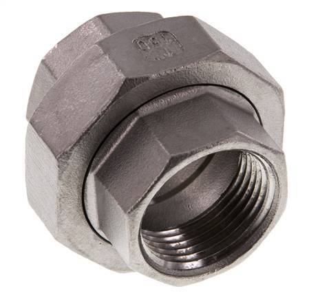 This screw connection is designed with female NPT threads on both sides. Connection 1 has female NPT 1 inch threads. Connection 2 has female NPT 1 inch threads. It is a straight fitting. It is made out of stainless steel (1.4408). At 20 °C (68 °F), it can handle a maximum pressure of 16 bar (232 psi). They have a 3-part design.