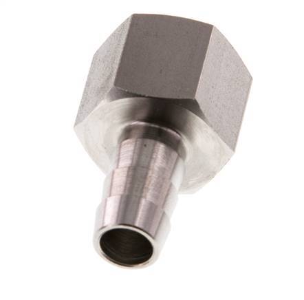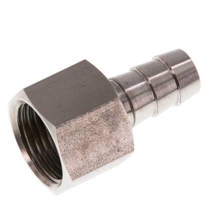 This stainless steel hose screw connection is designed with a hose pillar connection and female G threads. Connection 1 has female G 3/8 inch threads. Connection 2 is hose pillar, designed for a hose with an inner diameter of 9 mm. Max pressure of 40 bar (580 psi).