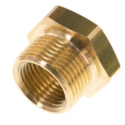 This reducing nipple is designed with male and female threads. Connection 1 has female G 1/2 inch threads. Connection 2 has male G 3/4 inch threads. It is a straight fitting. It is made out of brass. At 20 °C (68 °F), it can handle a maximum pressure of 16 bar (232 psi). It has a 32 mm nut to be tightened with a wrench.