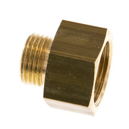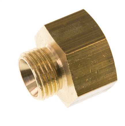 This reducing nipple is designed with male and female threads. Connection 1 has female G 3/4 inch threads. Connection 2 has male G 1/2 inch threads. It is a straight fitting. It is made out of brass. At 20 °C (68 °F), it can handle a maximum pressure of 16 bar (232 psi). It has a 32 mm nut to be tightened with a wrench.
