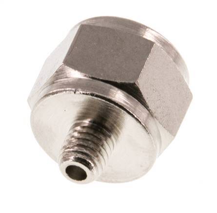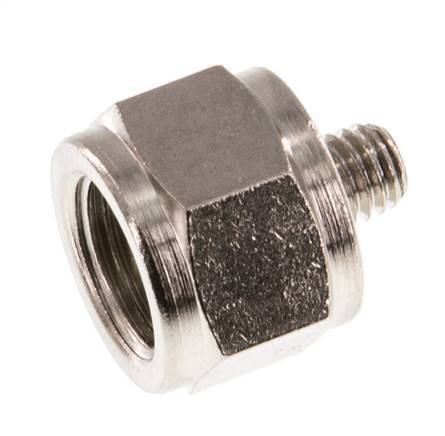 This reducing nipple is designed with male and female threads. Connection 1 has female G 1/8 inch threads. It is a straight fitting. It is made out of brass and is nickel-plated for surface protection. At 20 °C (68 °F), it can handle a maximum pressure of 16 bar (232 psi).