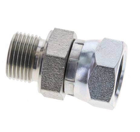 This steel adjustable screwed connection is designed with male g threads and female g threads (60 degree conical). Connection 1 has female G 3/8 inch threads. Connection 2 has male G 3/8 inch threads. Max pressure of 325 bar (4714 psi). It has a 60° conical inside the male threads.