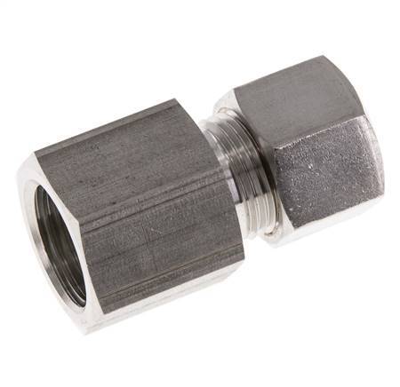This stainless steel straight screwed-on screw connections is designed with female threads and a compression ring connection point. Connection 1 has female G 1/2 inch threads. Connection 2 is a 12 mm compression ring. Suitable for temperatures from -60 °C to 400 °C (-76 °F to 752 °F). Max pressure of 630 bar (9138 psi). Rated for an S (heavy) load class. It is made in accordance with the DIN EN ISO 8434-1 (DIN 2353).