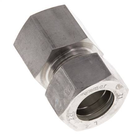 This stainless steel straight screwed-on screw connections is designed with female threads and a compression ring connection point. Connection 1 has female G 3/4 inch threads. Connection 2 is a 22 mm compression ring. Suitable for temperatures from -60 °C to 400 °C (-76 °F to 752 °F). Max pressure of 160 bar (2321 psi). Rated for an L (light) load class. It is made in accordance with the DIN EN ISO 8434-1 (DIN 2353).
