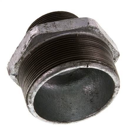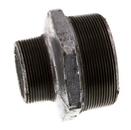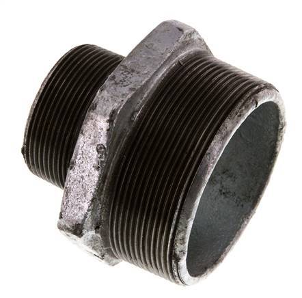 This double nipple is designed with male to male threads. Connection 1 has R 3 inch threads. Connection 2 has R 2 inch threads. It is a straight fitting. It is made out of cast iron (malleable) and is galvanic/electrolytic zinc plated for surface protection. At 20 °C (68 °F), it can handle a maximum pressure of 25 bar (363 psi).