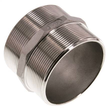 This stainless steel double nipple is designed with male to male threads. Connection 1 has male G 3 inch threads. Connection 2 has male G 3 inch threads. Max pressure of 16 bar (232 psi).