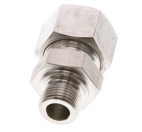 This straight screw in connection is designed with male threads and a cutting ring fitting connection. Connection 1 has male G 1/2 inch threads. Connection 2 is a 20 mm cutting ring. It is a straight fitting. It is made out of stainless steel (1.4571). It is suitable for media within a temperature range of -60 °C to 400 °C (-76 °F to 752 °F). At 20 °C (68 °F), it can handle a maximum pressure of 400 bar (5802 psi). According to the DIN 2353, it has an S (heavy) load class. It is made in accordance with the DIN EN ISO 8434-1 (DIN 2353). They have a 3-part design.